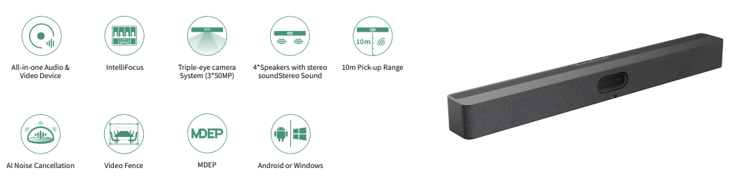 La Yealink MeetingBar A50 è una barra per videoconferenze all-in-one progettata per offrire prestazioni audio e video di livello superiore in sale riunioni da medie a grandi. Dotata delle più recenti tecnologie intelligenti, garantisce audio cristallino e immagini ultra-HD, trasformando ogni riunione in un’esperienza immersiva e altamente professionale. Funzionalità PrincipaliQualità audio e video di nuova generazione con tecnologia AI integrata Supporto full-duplex intelligente per conversazioni fluide e senza interruzioni IntelliFocus: messa a fuoco automatica intelligente su chi parla Video Fence: delimitazione intelligente del campo visivo per una maggiore privacy visiva Integrazione diretta con il pannello touch CTP25, per un accesso semplificato e veloce (OPZIONALE) Compatibilità totale con Microsoft Teams Rooms (MTR) su piattaforme Windows e Android Versione MTR-W -→ MVC S50 Supporta fino a 3 microfoni di espansione (OPZIONALE)