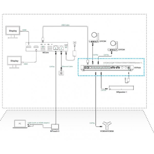 HUB per connettere più telecamere UVC86 UVC84 , MSspeaker II e VCM34 o VCM38 a miniPC sfruttando rete LAN.Yealink AVHub consente di collegare più videocamere, microfoni e speaker a un sistema di videoconferenza Yealink compatibile.Yealink AVHUB Supporta fino a 9 videocamere UVC84 e UVC86 (non incluse) anche con funzionalità di voice tracking / auto framing. Il layout delle videocamere è personalizzabile. Supporta fino a 8 microfoni VCM34 / VCM38. Supporta fino a 4 MSpeaker II AVHub è compatibile con MVC960/MVC940/MVC860/MVC840/MVC660/MVC640/MVC400/MVC320