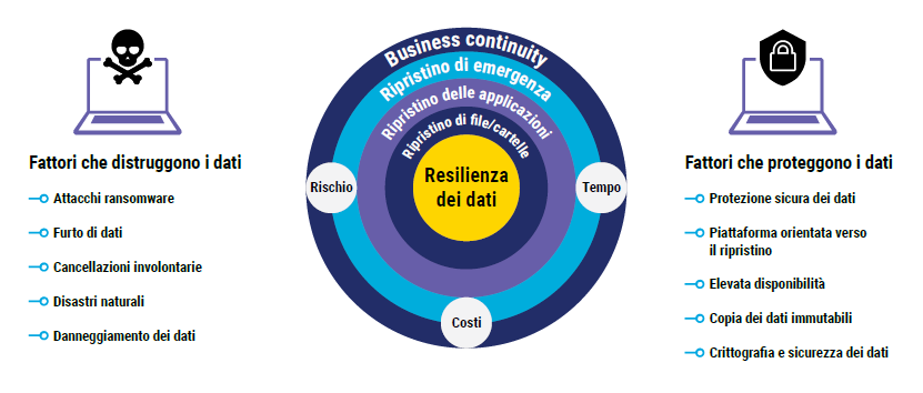 Per isolare i dati da tutto ciò che mette a rischio la loro integrità, le organizzazioni devono adottare una strategia di resilienza dei dati che preveda la protezione dei dati di produzione e di backup, la disponibilità di più copie di dati in posizioni diverse, la disponibilità di una copia di dati immutabile in sede o sul cloud e la disponibilit à di opzioni a elevata disponibilità per garantire la business continuity.