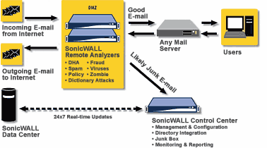 Le modalità SPLIT ARCHITECTURE consente di creare installazioni EmailSecurity ridondate e/o ad alta capacità prevedendo una o più unità che fungano da Control Center (CC) e una o più unità che svolgano il compito si Remote Analyzer (RA). Control Center e Remote analyzer, correttamente associati sul back-end di registrazione mysonicwall.com, condividono le licenze di EmailProtection Subscription (obbligatoria), modulo AntiVirus McAfee oppure Kaspersky (opzionale) e modulo di Compliance (opzionale).