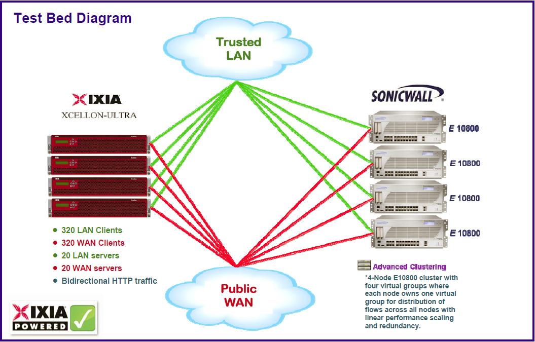 Il SonicWALL SuperMassive E10800 è stato configurato in un cluster a quattro nodi con quattro gruppi virtuali, dove ogni nodo disponeva di un gruppo virtuale per la distribuzione dei flussi attraverso tutti i nodi. Ogni SuperMassive E10800 montava il sistema SonicOS 6.0.0.11.