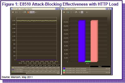 SonicWALL ha commissionato a Miercom l'analisi dell'appliance di sicurezza di rete E8510 per verificarne le prestazioni e l'efficacia della sicurezza. L'E8510 è un'appliance con Deep Packet Inspection (DPI) che combina funzionalità firewall come il rilevamento/prevenzione delle intrusioni alla protezione anti-virus/anti-spam e al filtraggio Web in un unico dispositivo. Le appliance di sicurezza della serie E-Class NSA presentano un'architettura hardware multicore concepita per grandi implementazioni aziendali. Il modello E8500 dispone inoltre del controllo intelligente delle applicazioni. Nel corso di questo test abbiamo valutato l'efficacia della sicurezza e il throughput delle applicazioni dell'NSA E8510 mentre tutti i servizi di sicurezza erano attivati. L'NSA E8510 ha fornito prestazioni eccellenti, garantendo senza difficoltà un throughput del traffico applicativo di 2,1 Gbps mentre era attiva l'ispezione Deep Packet. Grazie all'architettura multicore, l'appliance ha rilevato e bloccato efficacemente tutti gli attacchi subiti (vedi Figura 1). Per maggiori informazioni sulla topologia del "banco di prova", consultare la sezione Procedura di test nella pagina seguente di questo report.