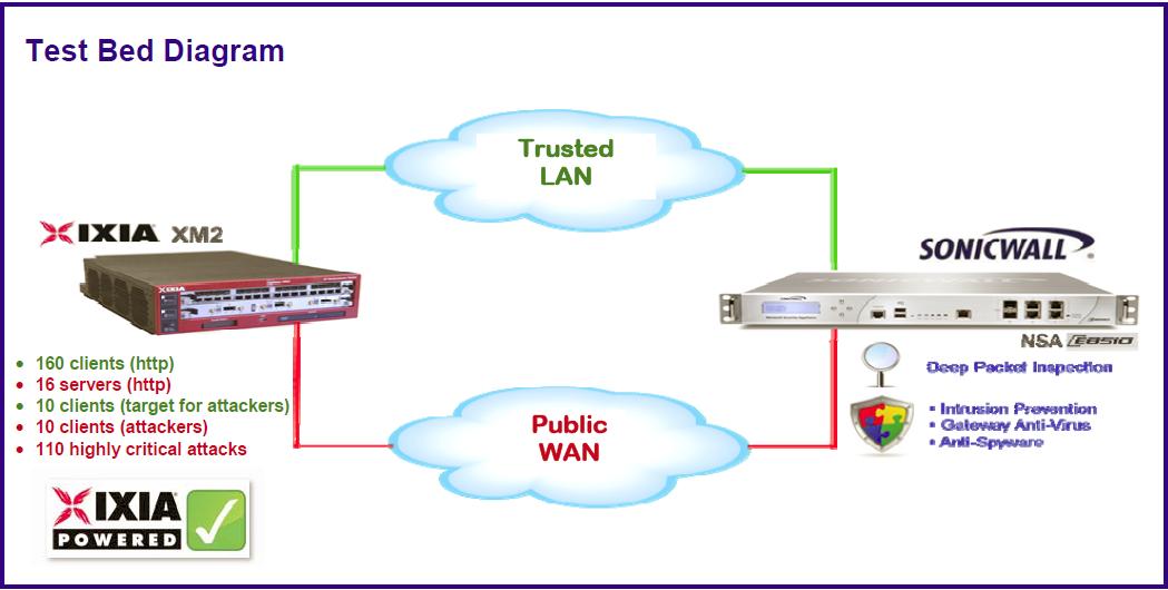 Il "banco di prova" è stato configurato con due zone di rete sull'NSA E8510, una LAN per i client trusted e una WAN pubblica. Per creare i flussi di traffico stateful tra client e server e il traffico degli attacchi provenienti dalla WAN è stato utilizzato un Ixia Optixia XM2. Per generare i flussi di traffico applicativo pulito sono stati utilizzati 16 server e 160 client. Per il traffico degli attacchi sono stati creati 10 client nella LAN da utilizzare come obiettivi, mentre 10 client nella WAN hanno diretto 110 attacchi verso questi obiettivi. Gli attacchi consistevano in buffer overflow, DoS, attacchi cross-site scripting e attacchi con caricamento ed esecuzione di codice.