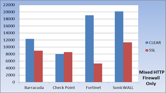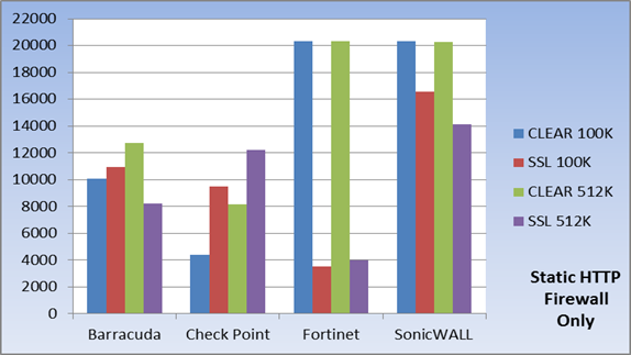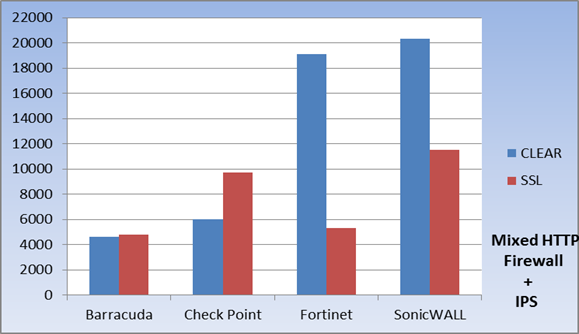 La stessa serie di test è poi stata nuovamente utilizzata con la crittografia SSL del traffico (senza abilitarne la decrittazione). Inoltre, è stata testa la scalabilità delle soluzioni utilizzando come metrica il numero di connessioni, ovvero il totale delle connessioni concorrenti e l'attestazione di nuove connessioni per secondo. Come gran finale, Network World ha testato le funzionalità di decrittazione SSL delle 4 soluzioni sotto esame; la decrittazione SSL è una operazione che impegna intensamente le risorse computazionali che di solito impatta gravemente sulle prestazioni del firewall di nuova generazione. Nel primo test, firewall only, Network World ha sottoposto le soluzioni dei 4 vendors a una varietà di traffico HTTP, inizialmente utilizzando pacchetti dalla dimensione variabile da 1KB a 1.536MB e quindi pacchietti di dimensione fissa da 100KB e 512KB rispettivamente. Durante questa serie di test, Sonicwall ha ottenuto prestazioni sensazionali superando la concorrenza in ogni possibile scenario. Infatti, SonicWALL Supermassive ha fatto così bene in questa serie di prove, che ha quasi esaurito le capacità delle attrezzature di prova messe in campo da Network World (a quasi 20 Gbps).
