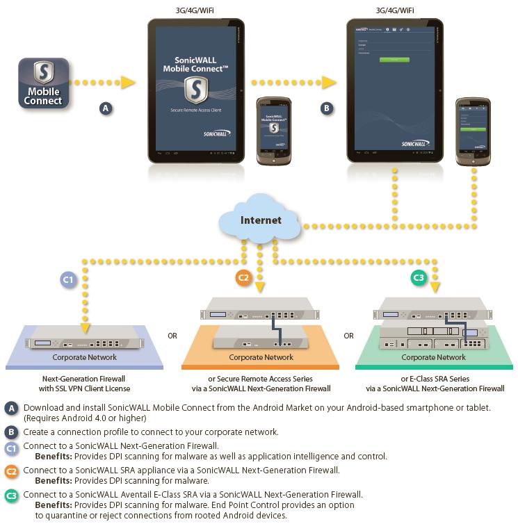 Inoltre, con le soluzioni SonicWALL Aventail ® E-Class Secure Remote Access (SRA) che dispongono di End Point Control ™ (EPC) è possibile consentire agli amministratori di definire dei criteri che identificano specifici attributi sul dispositivo e verificano la loro applicazione prima di consentire l'accesso alla rete aziendale. Grazie alla funzionalità EPC è possibile prevedere una politica per determinare se un dispositivo Android è stato "rooted" oppure un dispositivo iOS è stato sbloccato (jailbreak), in modo che le connessioni da questi sistemi possono essere rifiutate o messe in quarantena. Dato che smartphone e tablet vengono utilizzati all'interno della rete aziendale e possono connettervisi tramite WiFi, il traffico viene di conseguenza analizzato da un SonicWALL Next-Generation Firewall. Questo crea una connessione di tipo Clean Wireless che assicura ai dispositivi Android e iOS di aderire completamente alla sicurezza organizzativa, al controllo e all'applicazione delle politiche di filtraggio dei contenuti.