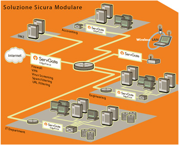 Perche' scegliere la sicurezza avanzata di ServGate? Perchè ServGate offre soluzioni di sicurezza che coprono tutte le esigenze di piccole, medie e grandi imprese, anche con reti distribuite. Perchè le soluzioni ServGate possono essere installate stand-alone o funzionare in maniera complementare rispetto a soluzioni di sicurezza già presenti. La piattaforma EdgeForce Serie M di ServGate è l'unico sistema per la sicurezza modulare, in continua evoluzione ed aggiornamento, in grado di offrire, riunite in un unico dispositivo, funzioni di URL Filtering, antivirus, antispam, antispyware, firewall, VPN, web caching e intrusion detection. Tutte le soluzioni ServGate implementano la tecnologia "Full Context Inspection", che fornisce, in un singolo dispositivo di sicurezza, un livello di analisi e protezione piu' approfondito rispetto ai normali appliance di sicurezza attualmente disponibili sul mercato.