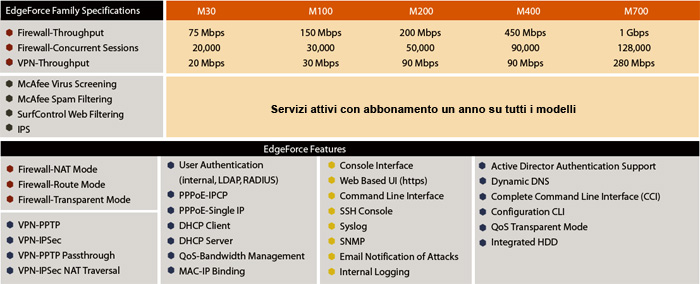La piattaforma EdgeForce Serie M copre tutte le esigenze delle piccole, medie e grandi imprese con reti distribuite, e che richiedono un elevato livello di sicurezza. L'EdgeForce Serie M è stato studiato per assicurare una protezione estesa anche su attacchi di Virus, Spyware, Malware, Spam e tentativi di intrusione. La piattaforma di sicurezza è stata studiata per soddisfare tutte le esigenze di sicurezza e compatibilità, con funzioni, come il "McAfee Security virus screening" e il "McAfee Security spam filtering", che aumentano il livello e la capacità di analisi e sicurezza su tutta la rete. La famiglia dei prodotti Servgate EdgeForce Serie M è composta da 5 prodotti: EdgeForce M30, EdgeForce M100, EdgeForce M200, EdgeForce M400 ed EdgeForce M700. Tutti e cinque implementano la stessa teconolgia e gli stessi servizi (Anti-Virus, Anti-Spam, ecc...) ma si differenziano per il numero massimo di utenti che posso gestire, infatti l'EdgeForce M30 può supportare fino ad un massimo di 30 utenti o l'EdgeForce M100 che supporta fino a 100 utenti.