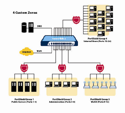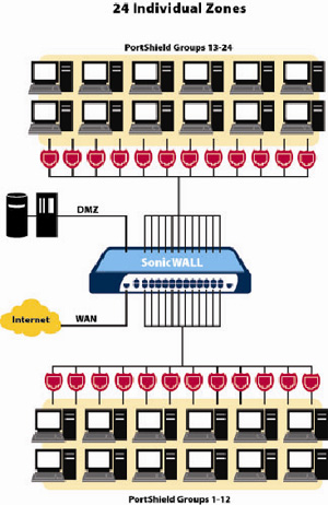 | Il SonicWALL PRO 1260 è una piattaforma di sicurezza totale con funzionalità di switch rivolta a filiali e aziende di piccole dimensioni, che oltre a caratteristiche come firewall Deep Packet Inspection, IPSec VPN, Anti-Virus Gateway, prevenzione delle intrusioni e filtraggio dei contenuti, contiene anche uno switch autosensing MDIX Layer 2 con 24 porte a velocità wire speed. Il SonicWALL PRO 1260 con firmware SonicOS Enhanced introduce la nuova architettura SonicWALL® PortShield, trasformando l'appliance in uno switch intelligente. L'innovativa architettura PortShield permette a tutte le 24 porte del PRO 1260 di essere configurate in maniera indipendente in zone di sicurezza personalizzate (PortShield group), ognuna con un “firewall virtuale”, con la possibilità di limitare la velocità con una granularità 64 Kbps per interfaccia. Il "Virtual firewalling" garantisce che le porte siano protette non solo verso Internet (WAN), ma anche verso gli altri dispositivi in LAN. Inoltre, il SonicOS Enhanced permette alcune funzioni di switching molto sofisticate, quali port-level rate limiting, traffic monitoring e statistiche. Note: l'aggiornamento al SonicOS Enhanced, per il SonicWALL PRO 1260, sarà disponibile a fine Marzo 2005. |