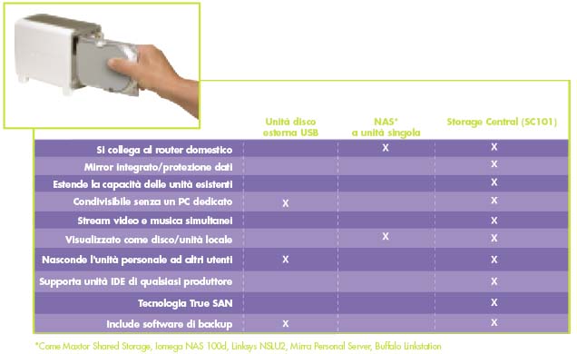 Storage Central è l' unità di storage condivisibile, espandibile e sicura accessibile da tutti i PC della rete che consente di aggiungere la capacità necessaria per archiviare, condividere e salvare i contenuti digitali importanti, quali musica, giochi, fotografie, video e documenti di lavoro, in modo istantaneo, facile e sicuro, come con una qualsiasi unità C:.