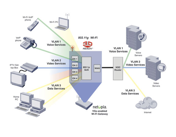 La priorità, sul tipo di traffico, segue lo standard IEEE 802.1p, che specifica le procedure di QoS da assegnare al traffico, basandola sul tipo di protocollo e sulla sorgente. Tutto ciò assicura che ogni servizio riceva il giusto QoS richiesto. Per esempio con la tecnologia Netopia VGx non si avranno più latenze sul segnale video, il servizio VoIP avrà un livello di priorità tale da assicurare la perfetta ricezione e trasmissione della voce, e i dati verranno ruotati in maniera efficace e sicura.