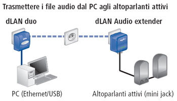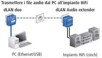 Con il dLAN Audio extender ampliate la vostra rete domestica dLAN per qualsiasi applicazione audio. Adesso potete riprodurre il vostro brano preferito da un server musicale e ascoltarlo in qualsiasi punto di un circuito elettrico chiuso attraverso il vostro impianto HiFi. Naturalmente anche il PC o ilserver sui quali si trova il vostro archivio musicale digitale devono essere collegati alla rete. A tale scopo l'adattatore dLAN duo (contenuto nello Starter Kit) viene innestato in una presa di corrente libera e collegato al PC tramite un cavo USB o Ethernet.