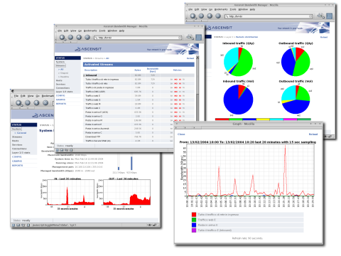 | Funzionalità di Monitoring e Reporting: Gli apparati Ascensit Bandwidth Manager consentono il monitoraggio della quantità e/o del tipo di traffico in ingresso e in uscita alla rete. La reportistica può riguardare specifici indirizzi di rete, intere reti e addirittura gruppi di reti. Tutte le statistiche sono visualizzate sia in forma grafica che tabellare. |