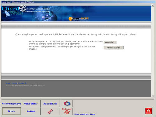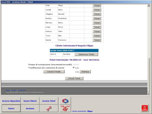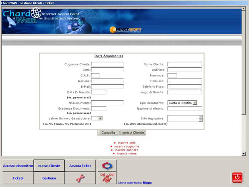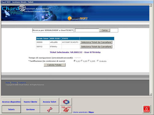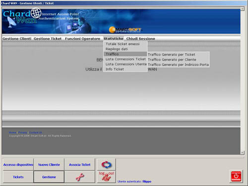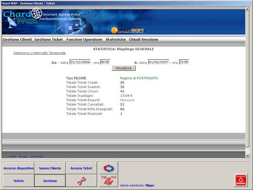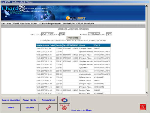 Chi mi può aiutare nella gestione di questi Hot Spot? ChardWAN! Come abbiamo anticipato, ChardWAN è un servizio WEB che registra e analizza i dati prodotti da un Hotspot presentandoli al gestore in modo facile e comprensibile, sollevandolo completamente dalla gestione dei dati anagrafici e di navigazione dei clienti perchè questi vengono raccolti in una banca-dati blindata presso provider nazionali su server remoti gestiti dalla Smart Soft. Il controllo dei dati registrati da ChardWAN può essere effettuato tramite WEB oppure trenite un piccolo software client da installare su un pc (sotto potete vedere alcune immagini del programma).