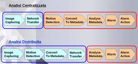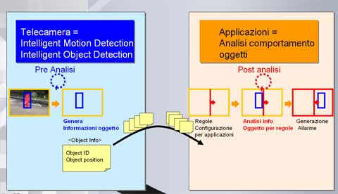 Analisi pre-processing sulla telecamera L'elemento innovativo principale è il trasferimento di una buona parte dell'analisi delle immagini alla network camera (da qui l'appellativo di Analisi Distribuita): mentre tutti gli altri sistemi di VideoSorveglianza delegano tutto il processo di analisi e rilevazione degli allarmi al dispositivo centrale (network server o PC con software di monitoraggio installato), l'Intelligence Sony permette alla telecamera stessa di eseguire le operazioni di: