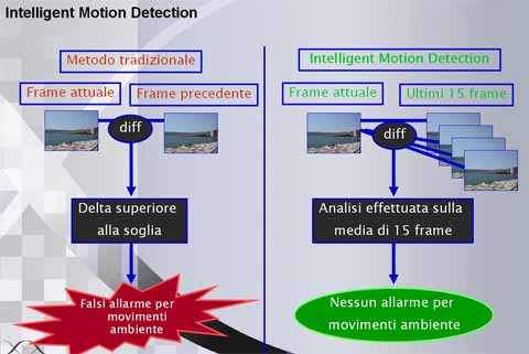 In definitiva, l'Intelligence Motion Detection permette di individuare solo i movimenti significativi presenti nella sequenza video; l'esecuzione in tempo reale della procedura consente quindi una segnalazione degli allarmi più efficiente senza l'introduzione di ritardi rilevanti.