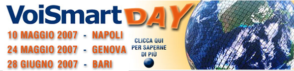 Visto il notevole successo dei primi eventi organizzati nei mesi scorsi, VoiSmart, in collaborazione con Alias, sta organizzando nuovi VoiSmart Days, dove i responsabili commeciali e tecnici di VoiSmart potranno presentare l'azienda, le prospettive di mercato e le soluzioni proposte per affrontare con competitività e professionalità il mondo del VoIP. Il prossimo appuntamento si terrà giovedì 10 maggio 2007 con il VoiSmart Day a Napoli, presso il Jolly Hotel Napoli, in Via Medina 70. Sono ancora disponibili posti per aderire; chi ancora non lo avesse fatto, ma volesse partecipare all'evento, può far pervenire la propria adesione mediante il sito Alias cliccando qui. La partecipazione è gratuita. Gli appuntamenti successivi saranno: