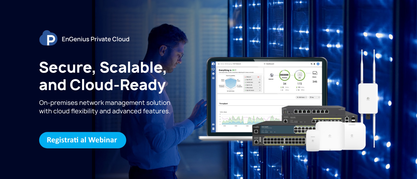 Engenius - Webinar EnGenius by Alias: Novità di prodotto e la piattaforma EPC (EnGenius private cloud)Alias è lieta di inviarti al webinar organizzato da Alias dove verrà presentata la nuova piattaforma di gestione centralizzate EPC (EnGenius Private Cloud) e le sue funzionalità. Inoltre carrellata sui nuovi prodotti ora disponibili